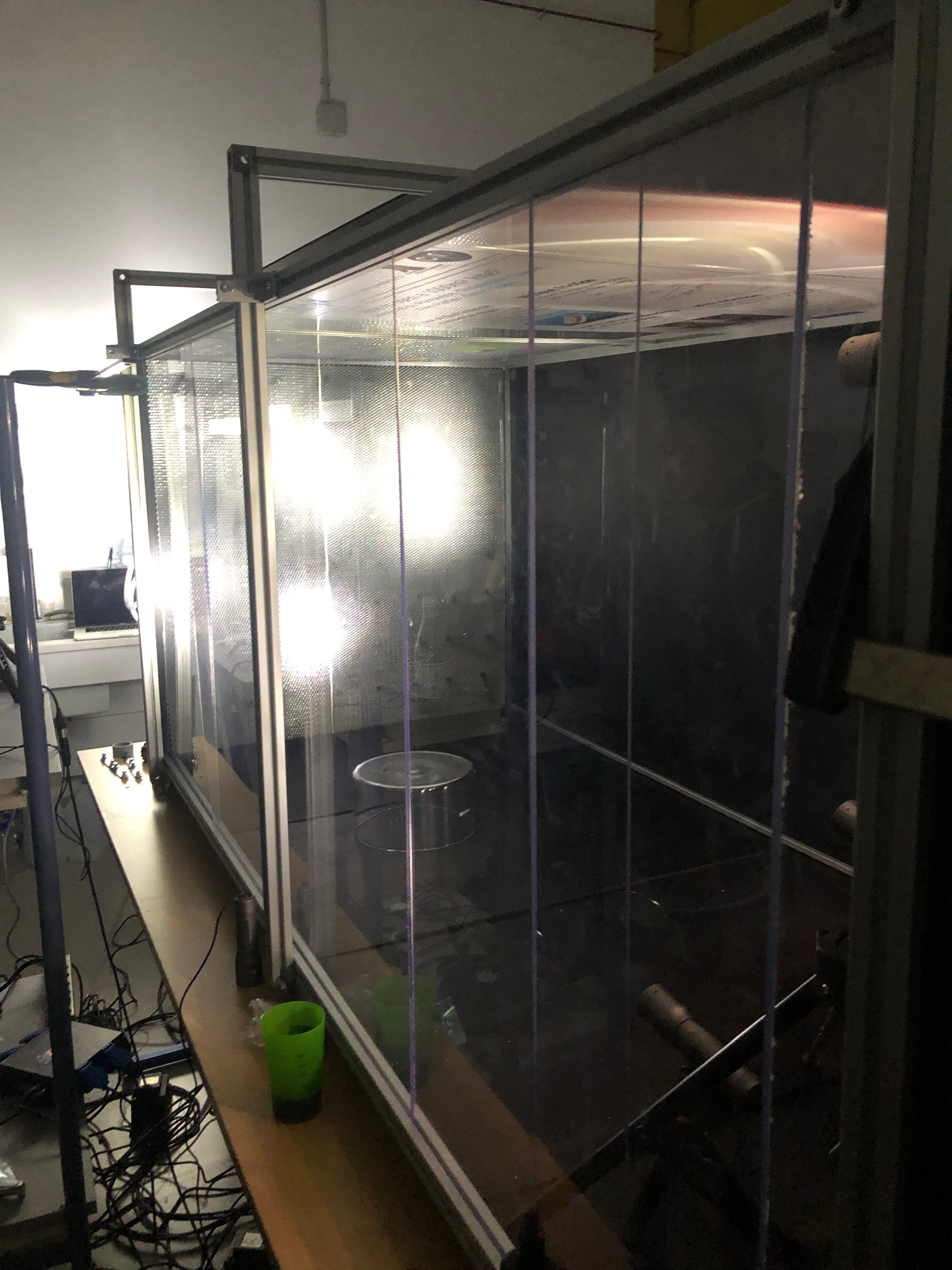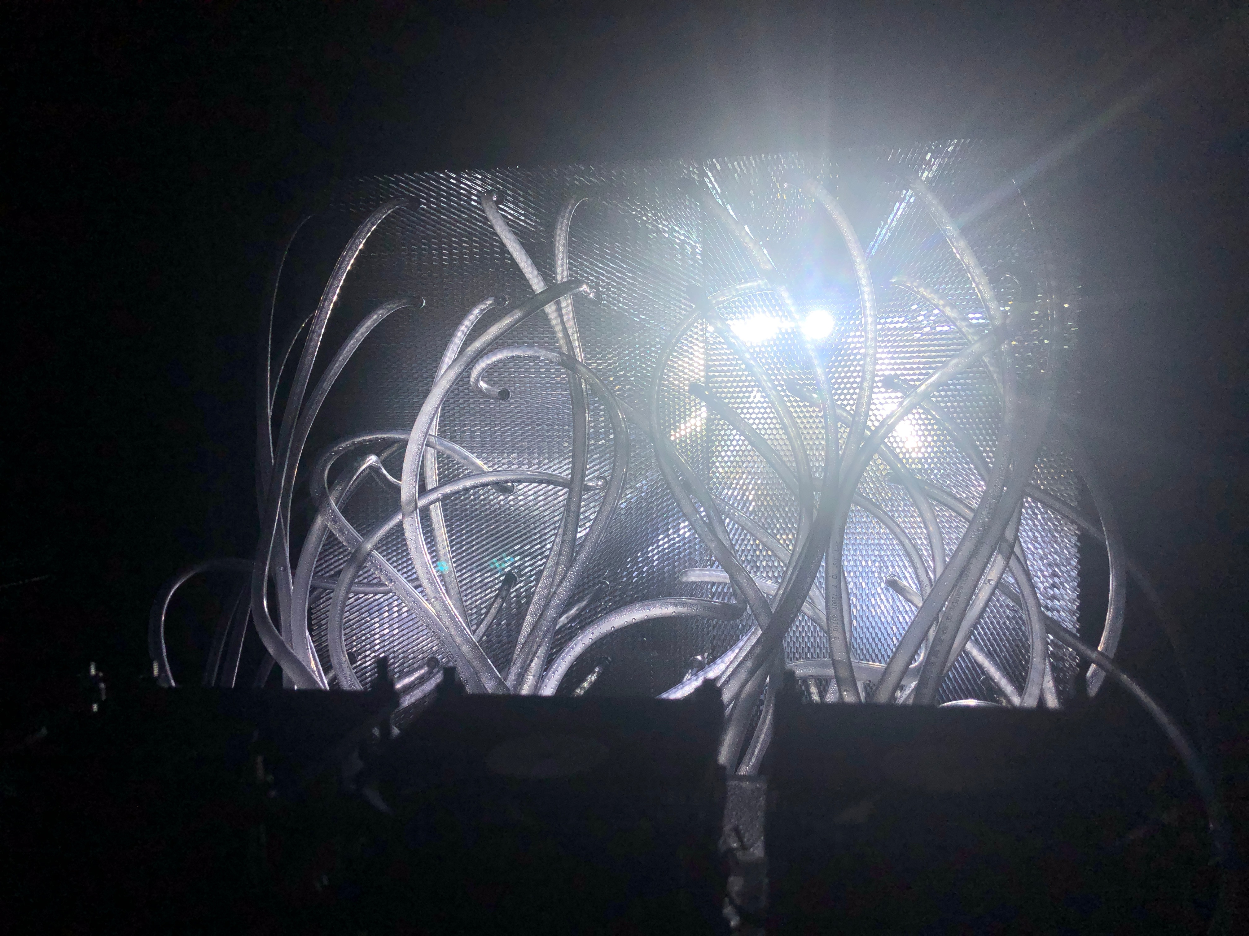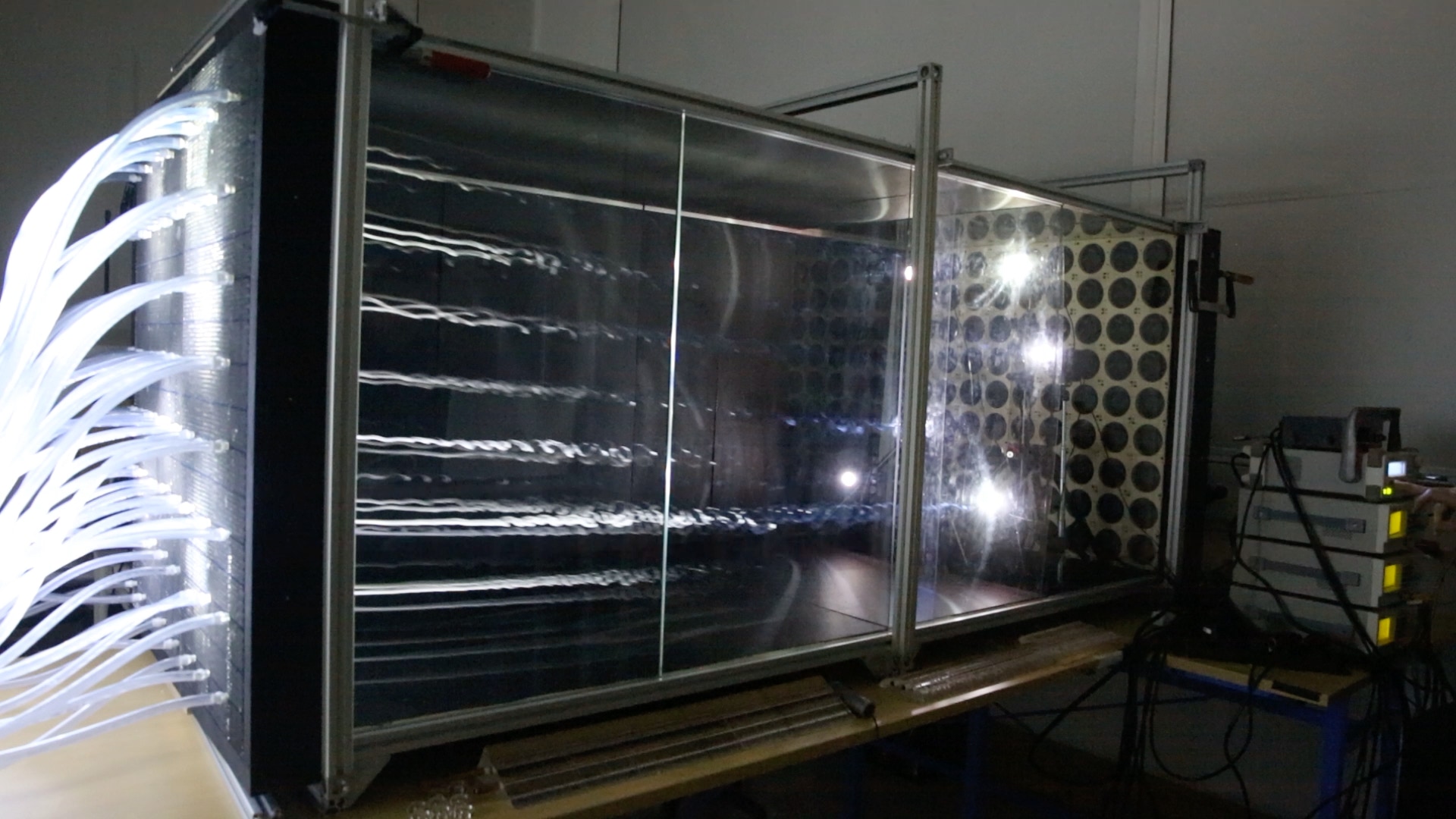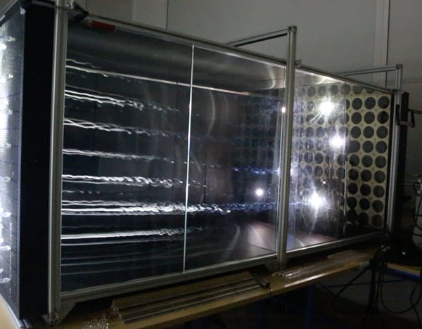 9 • View of the honeycomb panel air intake. The role of the honeycomb is to divide the air flow into a large number of laminar micro-streams, so as to allow the mist to maintain its configurations as long as possible. The light comes from the LED spotlights that are installed at the other ed of the enclosure.
