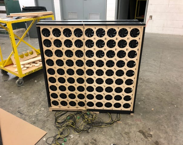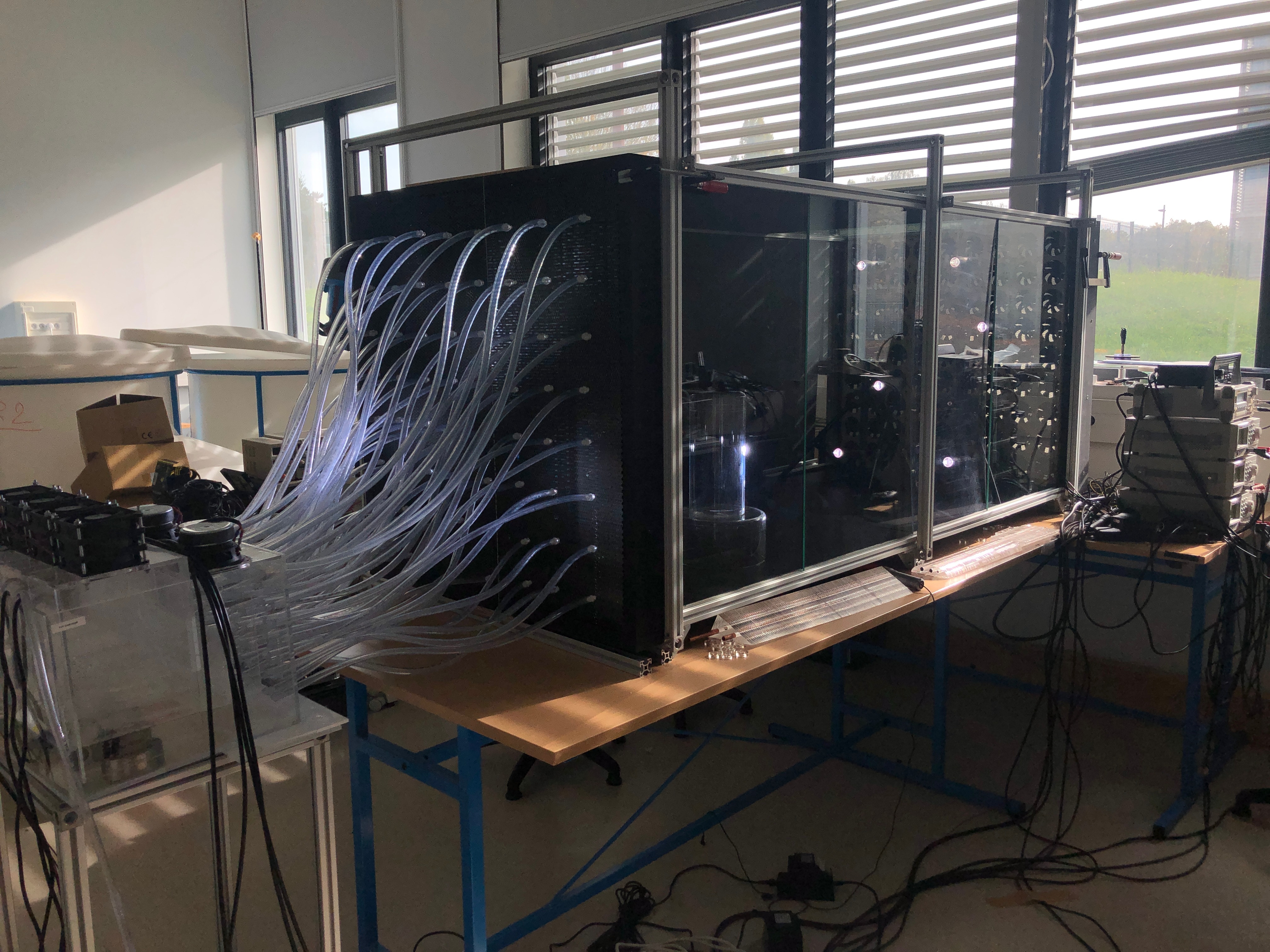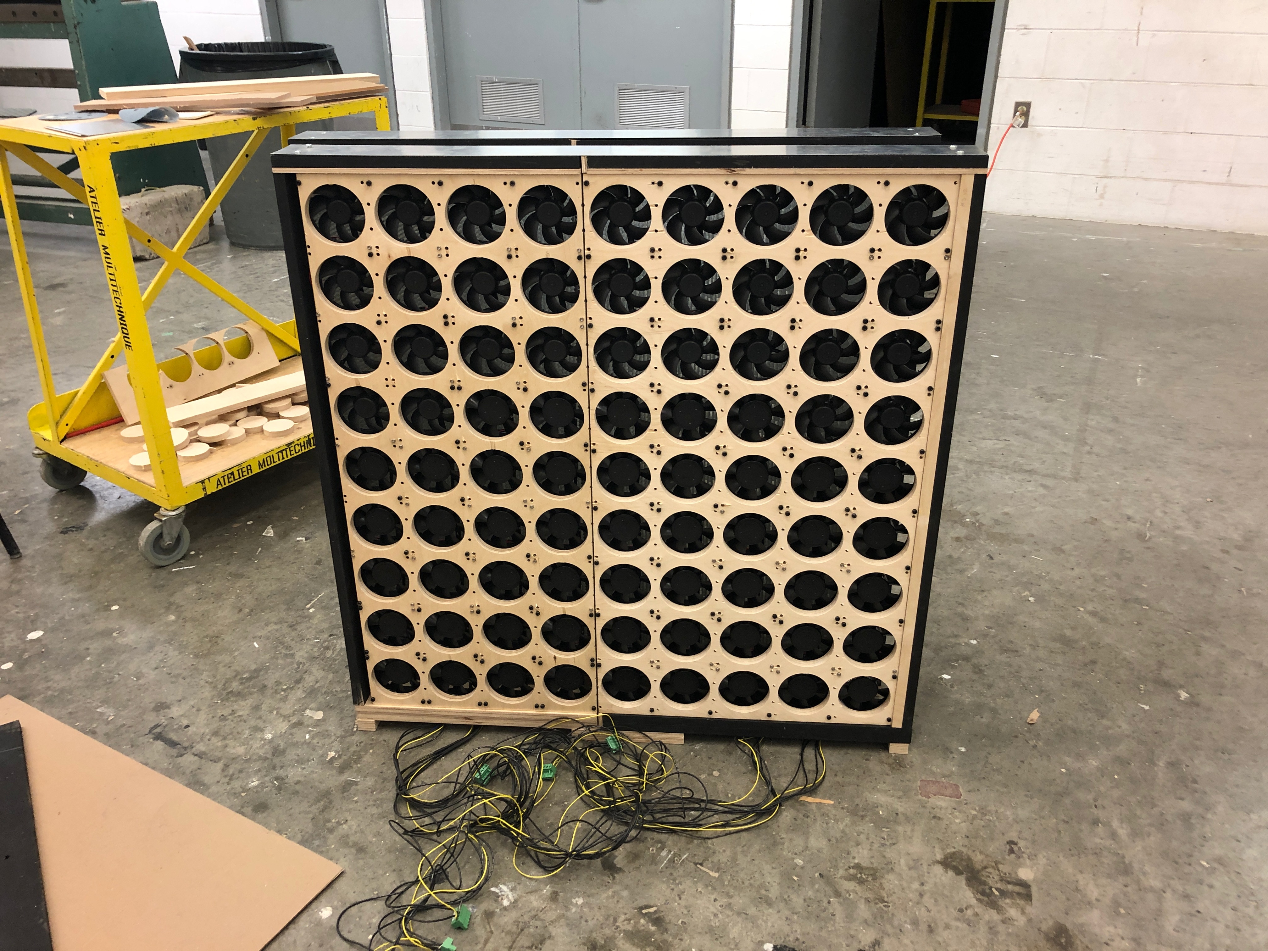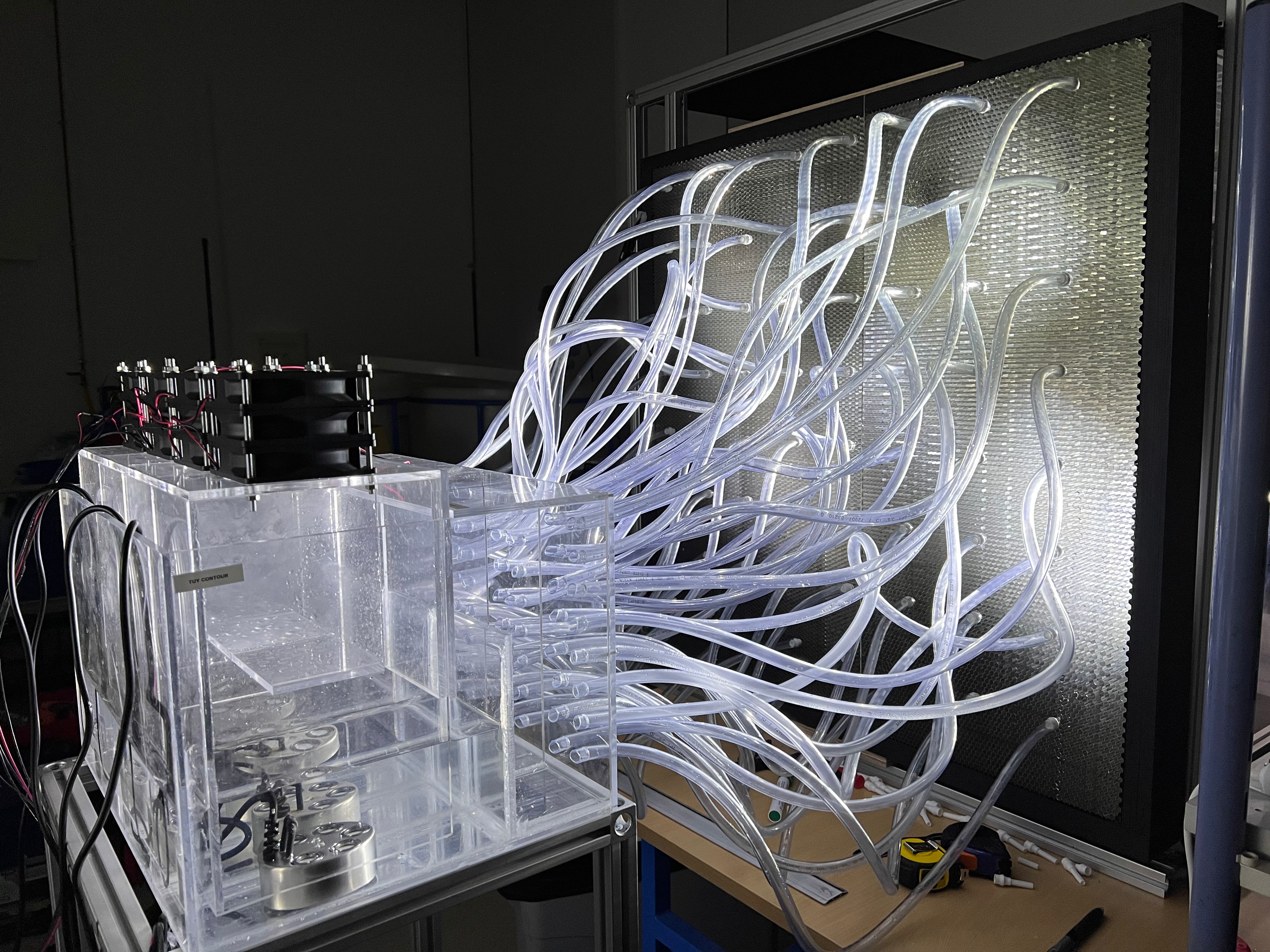 5 • View of the mist generator module. The compressors sit on the top. The mist generators themselves can be seen on the bottom; they are immersed in water. The 64 vinyl tubes are connected to the honeycomb panel intake by a streamlined manifold. The loudspeakers are not installed in this picture (see Fig. 7).