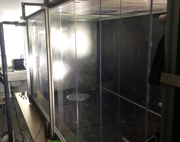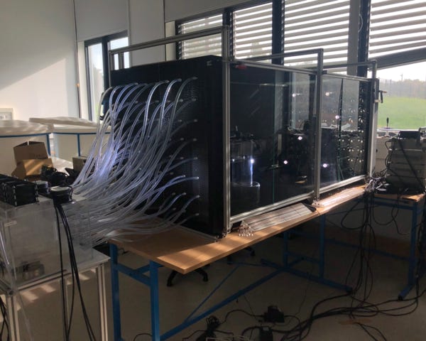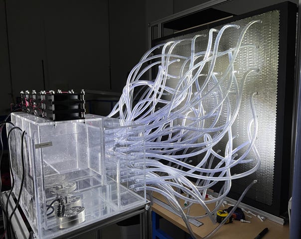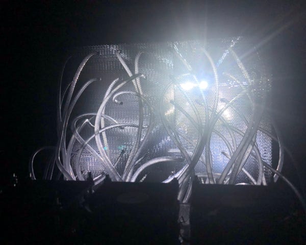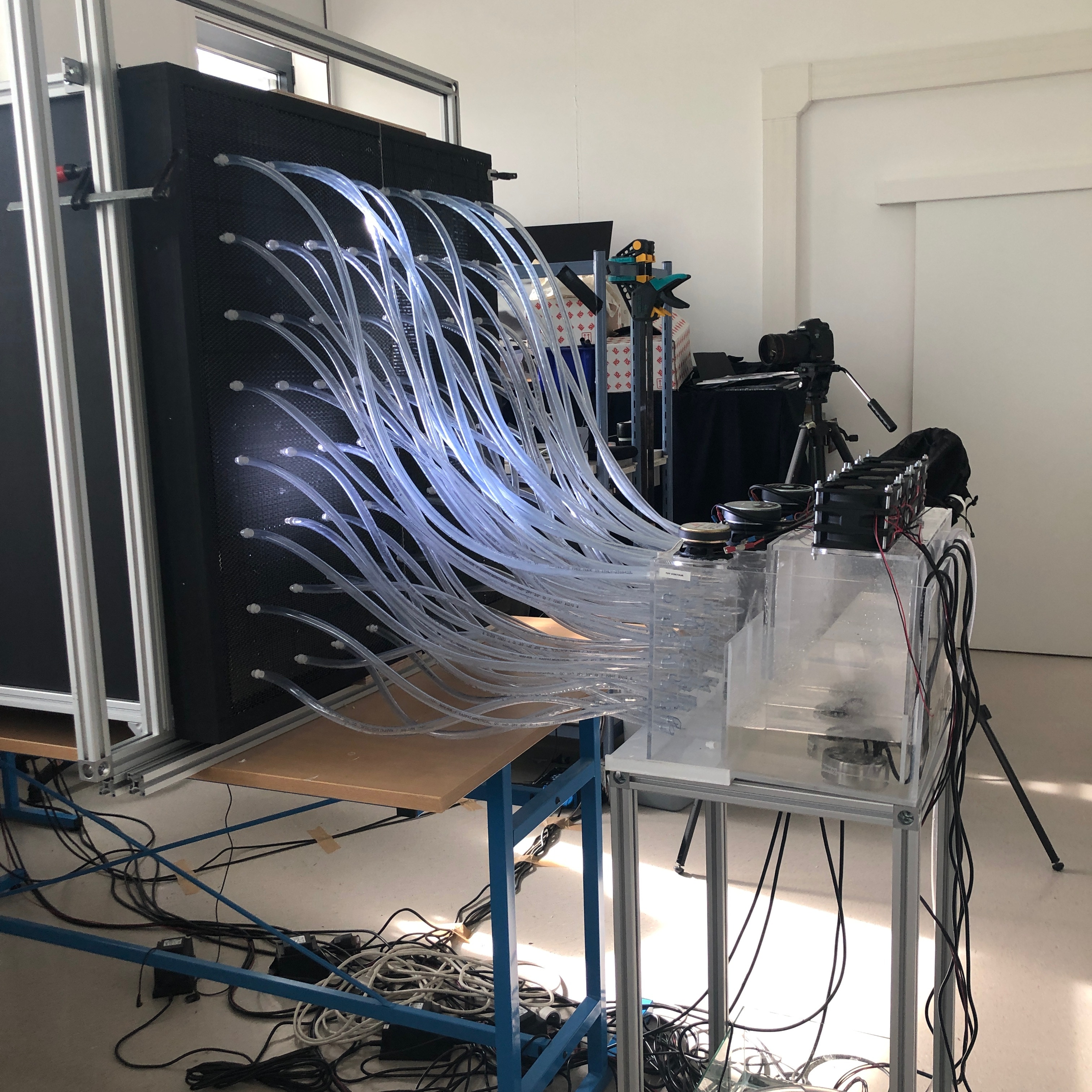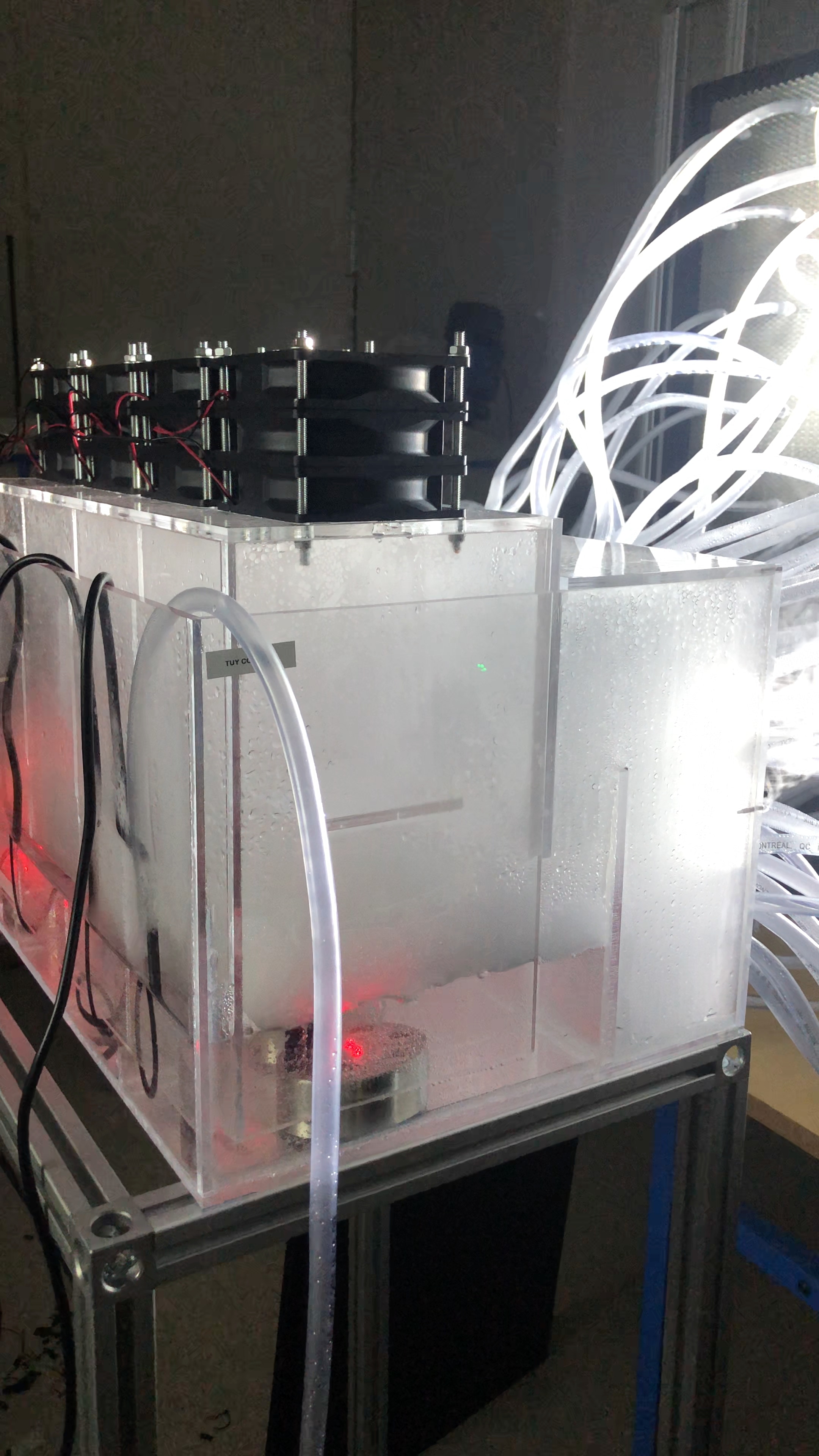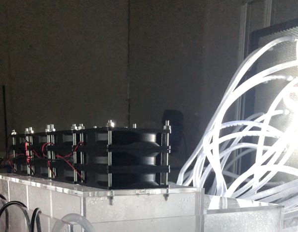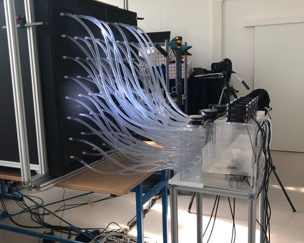 5 • View of the mist generator module. The compressors sit on the top. The mist generators themselves can be seen on the bottom; they are immersed in water. The 64 vinyl tubes are connected to the honeycomb panel intake by a streamlined manifold. The loudspeakers are not installed in this picture (see Fig. 7).