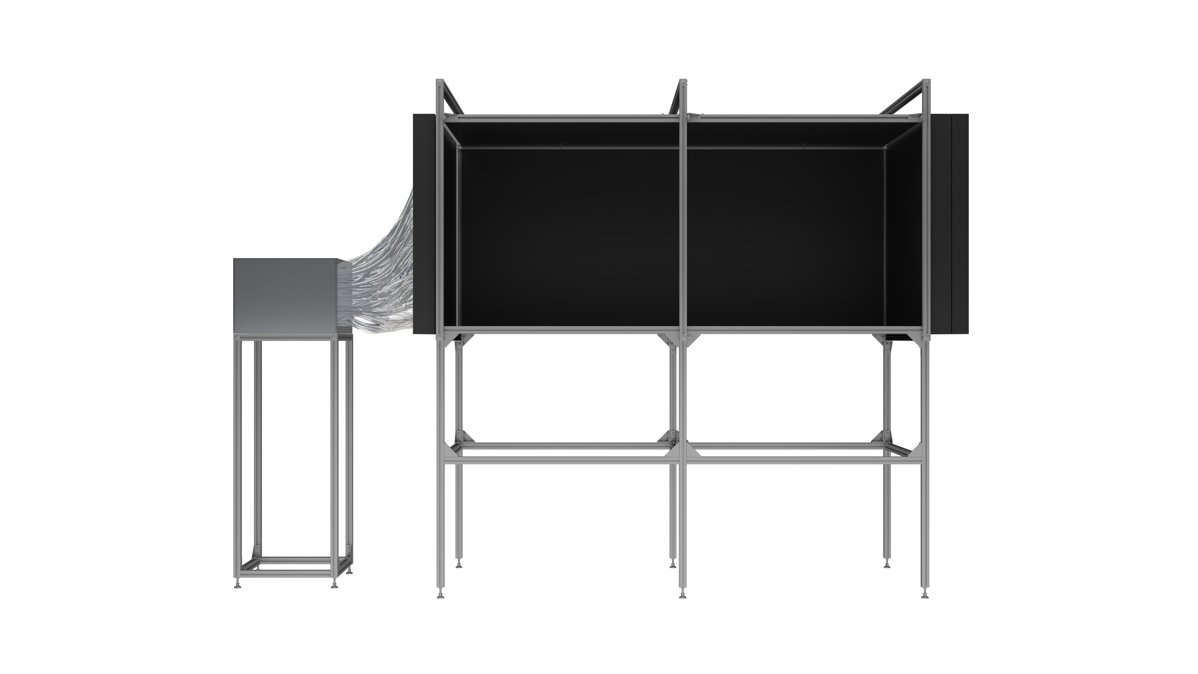 2 • Diagram of the installation. On the left, the module containing the mist generators, the compressors and the loudspeakers. On the right, the main enclosure. Both are connected by 64 vinyl tubes.
